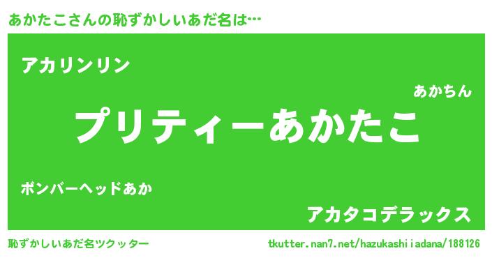 | 男性向けラノベタイトル風あだ名 | 『魔弾の王とあかたこ』『あかたこの憂鬱』 |
