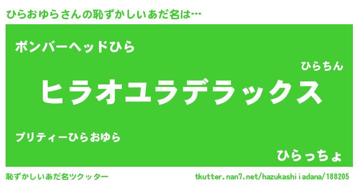 | 男性向けラノベタイトル風あだ名 | 『Re:ひらおゆらから始める異世界生活』 |