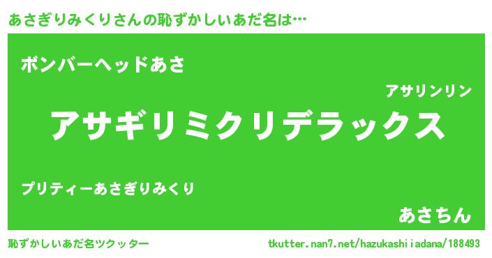 | 男性向けラノベタイトル風あだ名 | 『アサギリミクリスレイヤー』 |