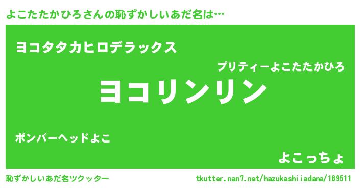 | 男性向けラノベタイトル風あだ名 | 『よこたたかひろ~年齢イコール彼女いない歴の魔法使い~』 |