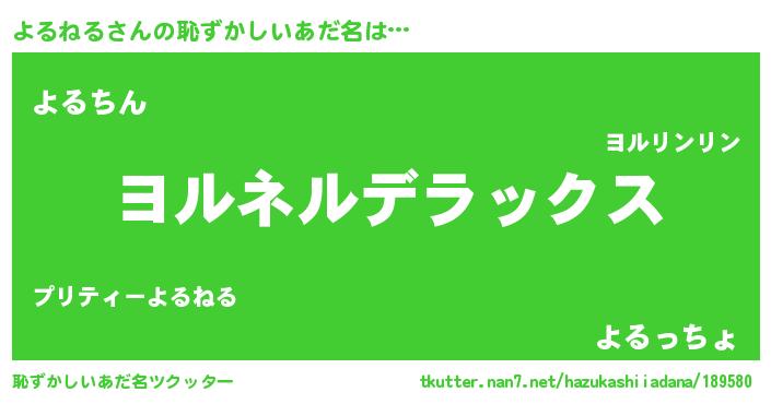 | ヘコむあだ名 | 『よるねる(震え声)』『酢こんぶ』 |