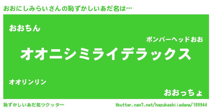 | 意味不明あだ名 | 『自称おおにしみらい』 |