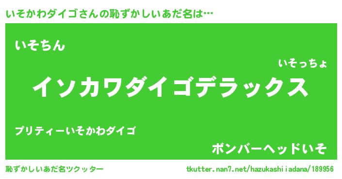| 男性向けラノベタイトル風あだ名 | 『いそかわダイゴに滅ぼされるだけの簡単なお仕事です』 |