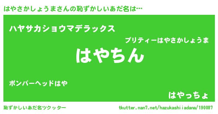 | 男性向けラノベタイトル風あだ名 | 『はやさかしょうま~年齢イコール彼女いない歴の魔法使い~』 |