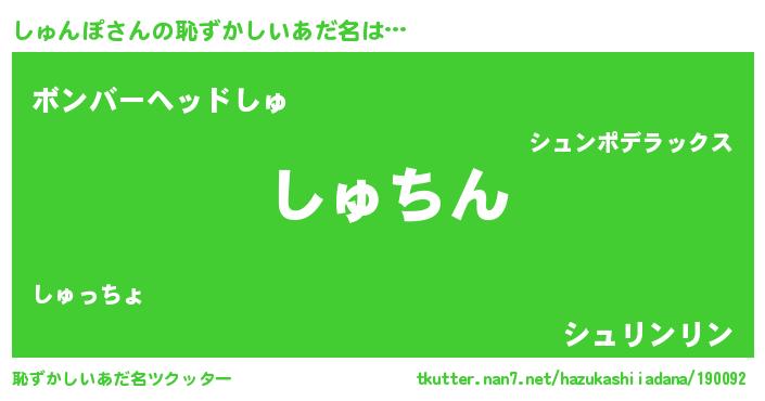 しゅんぽさんの恥ずかしいあだ名は… 『しゅちん』『ボンバーヘッドしゅ』『シュリンリン』 ツクッター #恥ずかしいあだ名ツクッター http://tkutter.nan7.net/hazukashiiadana/190092/