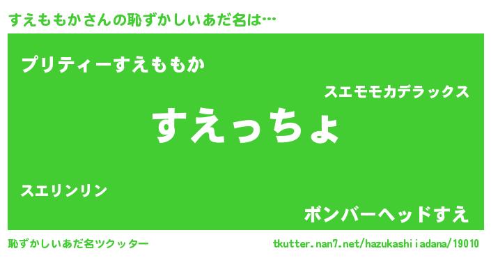 すえももかさんの恥ずかしいあだ名は… 『すえっちょ』『プリティーすえももか』『ボンバーヘッドすえ』 ツクッター #恥ずかしいあだ名ツクッター http://tkutter.nan7.net/hazukashiiadana/19010/