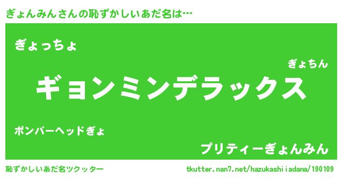 | 男性向けラノベタイトル風あだ名 | 『Re:ぎょんみんから始める異世界生活』 |