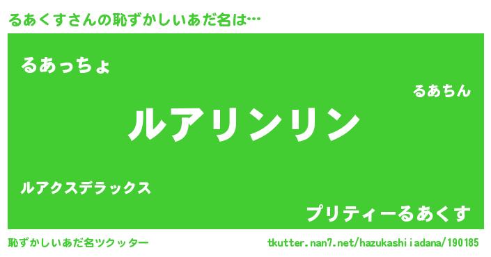 | 男性向けラノベタイトル風あだ名 | 『るあくすの嫁は女の子じゃないと思った?』 |