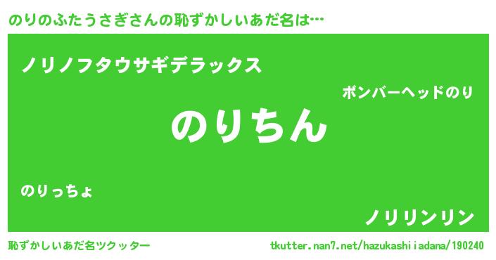 | 男性向けラノベタイトル風あだ名 | 『転生したらのりのふたうさぎだった件』 |