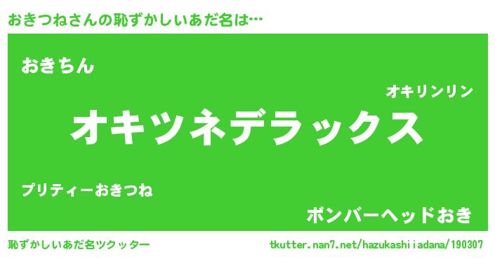 | 意味不明あだ名 | 『自称おきつね』『永久保存おきつね』 |