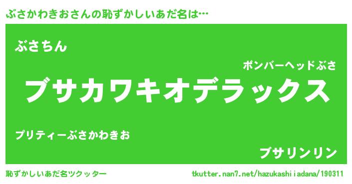 | 意味不明あだ名 | 『住所不定無職ぶさかわきお(14歳)』 |