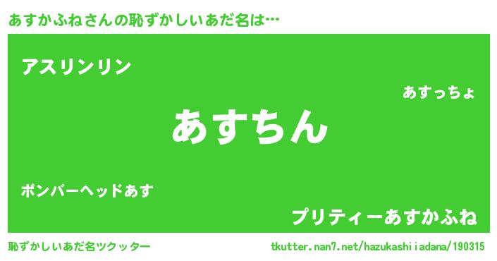 | ヘコむあだ名 | 『あすかふね(笑)』『あすお』『牛乳』 |