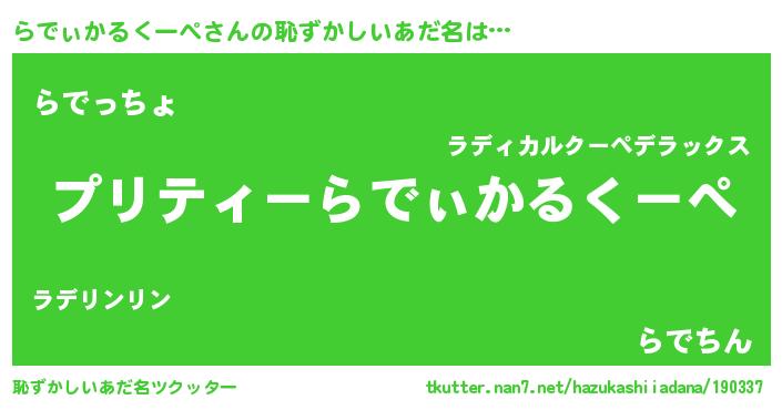 | 意味不明あだ名 | 『住所不定無職らでぃかるくーぺ(4歳)』 |