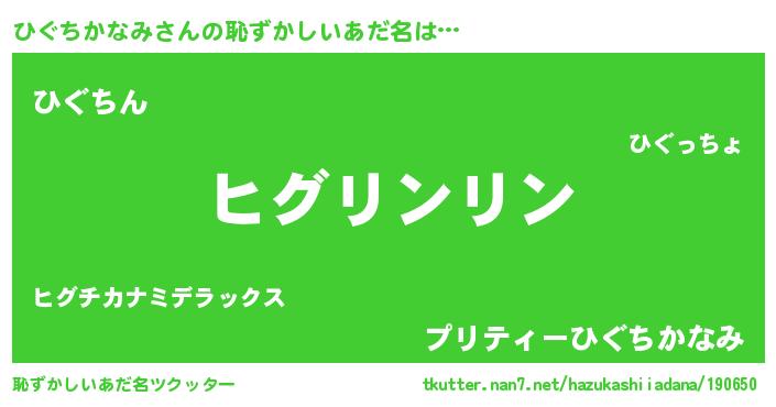 | ポケモン風あだ名 | 『ヒヒグチカナミ』『ゼニヒグ』 |