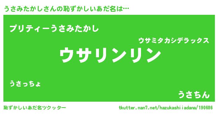 | 男性向けラノベタイトル風あだ名 | 『転生したらうさみたかしだった件』 |