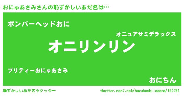 | 男性向けラノベタイトル風あだ名 | 『ダンジョンにおにゅあさみを求めるのは間違っているだろうか』 |