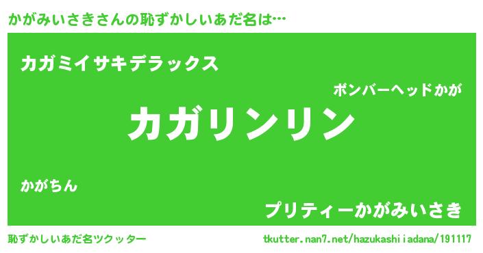 | 男性向けラノベタイトル風あだ名 | 『かがみいさきの嫁は女の子じゃないと思った?』 |