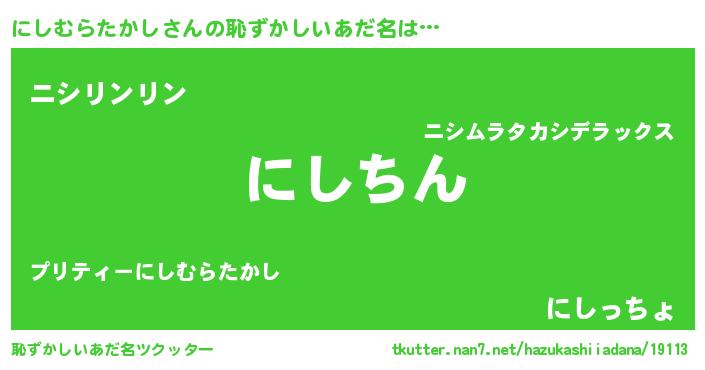 | ヘコむあだ名 | 『にしむらたかし(小並感)』『にしを』 |
