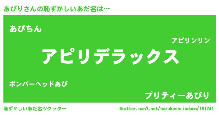 | 意味不明あだ名 | 『自称あぴり』『永久保存あぴり』 |