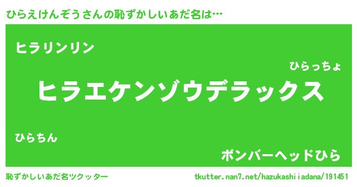 | 男性向けラノベタイトル風あだ名 | 『Re:ひらえけんぞうから始める異世界生活』 |
