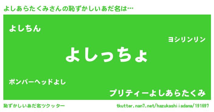 | ヘコむあだ名 | 『酢こんぶ』『よしあらたくみ(苦笑)』 |
