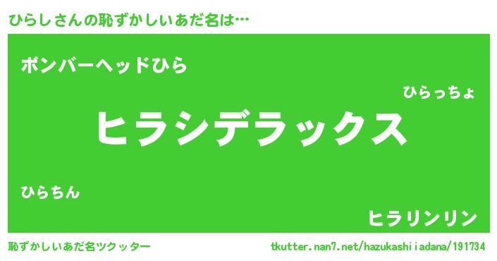 | 男性向けラノベタイトル風あだ名 | 『Re:ひらしから始める異世界生活』 |