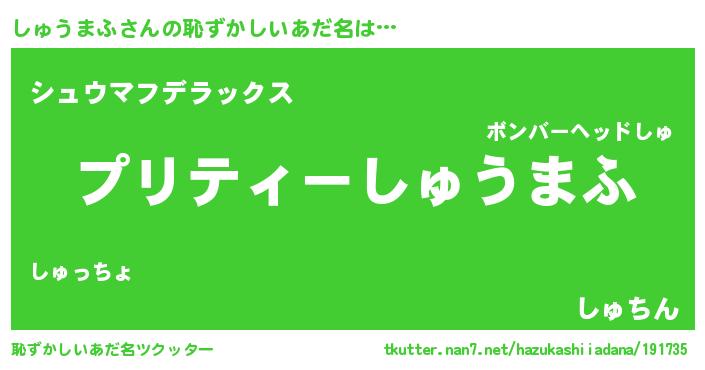 | ヘコむあだ名 | 『しゅにゅー』『しゅうまふ(小並感)』 |