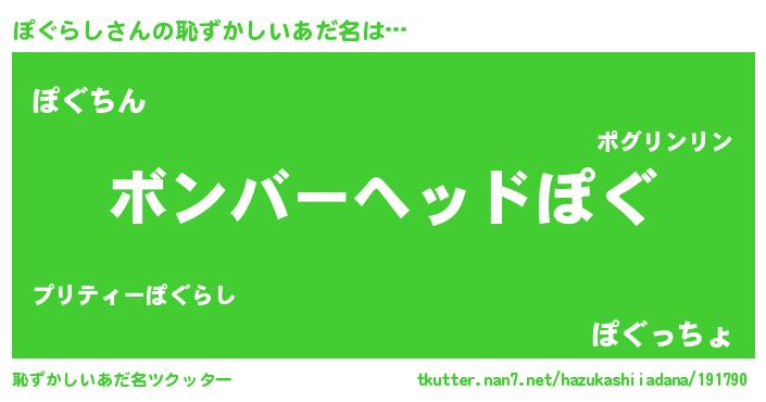 | ヘコむあだ名 | 『ぽぐらし(震え声)』『豆乳』 |