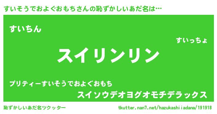 | 胡散臭い通販商品みたいなあだ名 | 『信頼と実績のサプリメント…その名も「すいそうでおよぐおもち」』 |