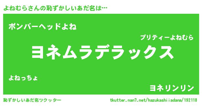 | 意味不明あだ名 | 『自称よねむら』『つくし科よねむら属』 |