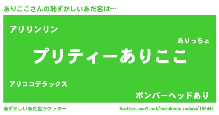 | 男性向けラノベタイトル風あだ名 | 『緋弾のアリココ』『ありここの憂鬱』 |
