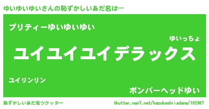 ゆいゆいゆいさんの恥ずかしいあだ名は… 『ユイユイユイデラックス』『プリティーゆいゆいゆい』『ボンバーヘッドゆい』 ツクッター #恥ずかしいあだ名ツクッター http://tkutter.nan7.net/hazukashiiadana/192967/