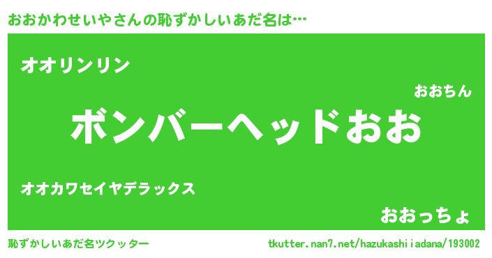 | 男性向けラノベタイトル風あだ名 | 『おおかわせいやに滅ぼされるだけの簡単なお仕事です』 |