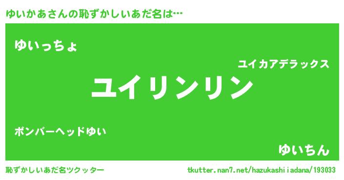 | 男性向けラノベタイトル風あだ名 | 『ゆいかあの嫁は女の子じゃないと思った?』 |