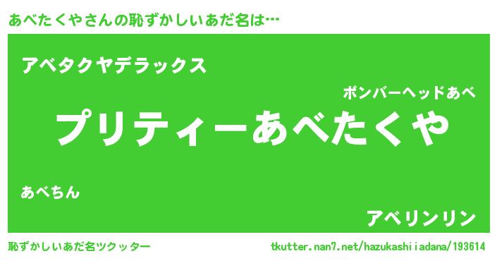 | 意味不明あだ名 | 『ペロリンあべたくや』『自称あべたくや』 |