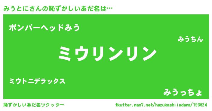 みうとにさんの恥ずかしいあだ名は… 『ミウリンリン』『ボンバーヘッドみう』『みうっちょ』 ツクッター #恥ずかしいあだ名ツクッター http://tkutter.nan7.net/hazukashiiadana/193624/