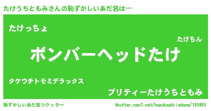 | 男性向けラノベタイトル風あだ名 | 『たけうちともみ~年齢イコール彼女いない歴の魔法使い~』 |