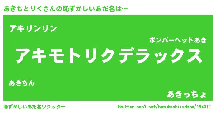 | 意味不明あだ名 | 『自称あきもとりく』 |