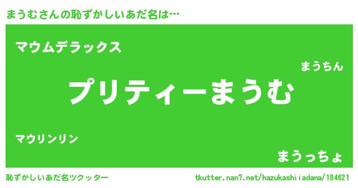 | 男性向けラノベタイトル風あだ名 | 『まうむ~年齢イコール彼女いない歴の魔法使い~』 |