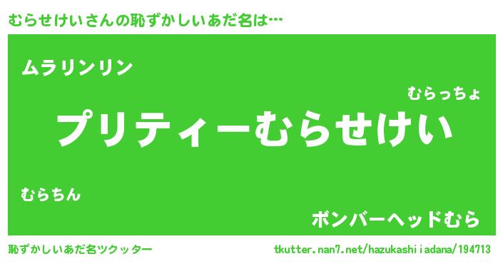 | 男性向けラノベタイトル風あだ名 | 『むらせけいの憂鬱』 |
