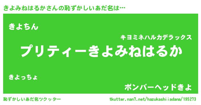 | 女子向けラノベタイトル風あだ名 | 『きよみねはるかの玉の輿計画!』 |