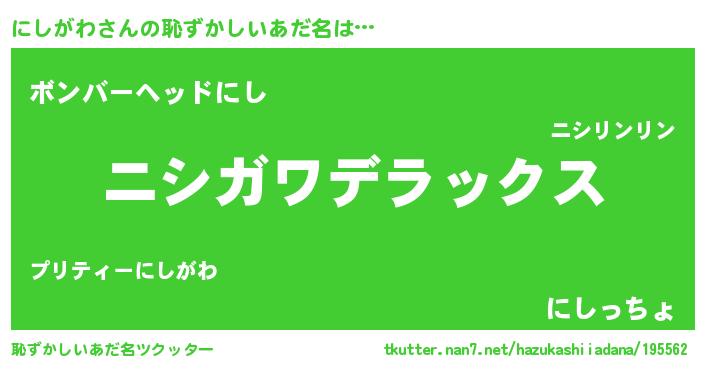 | 男性向けラノベタイトル風あだ名 | 『Re:にしがわから始める異世界生活』 |