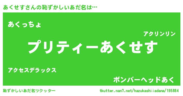あくせすさんの恥ずかしいあだ名は… 『プリティーあくせす』『あくっちょ』『ボンバーヘッドあく』 ツクッター #恥ずかしいあだ名ツクッター http://tkutter.nan7.net/hazukashiiadana/195884/
