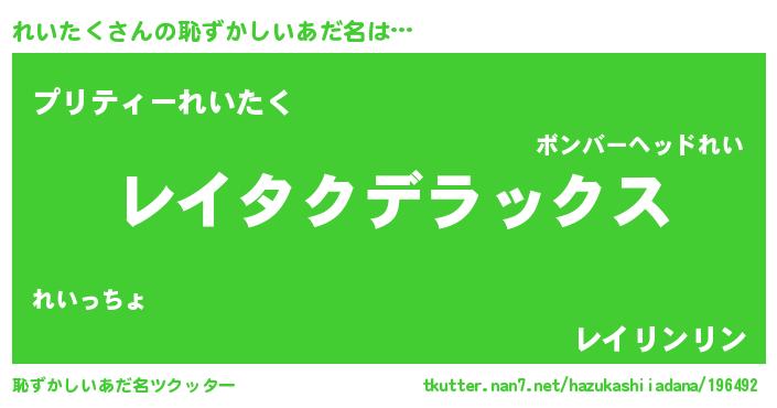 | 意味不明あだ名 | 『自称れいたく』『ペロリンれいたく』 |