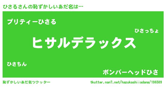 | 男性向けラノベタイトル風あだ名 | 『Re:ひさるから始める異世界生活』 |