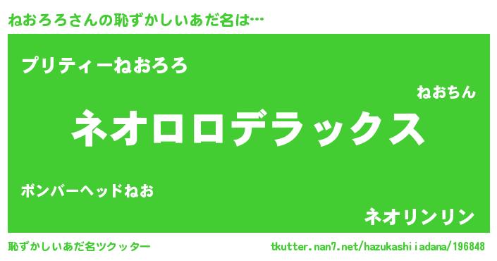 | 男性向けラノベタイトル風あだ名 | 『Re:ねおろろから始める異世界生活』 |