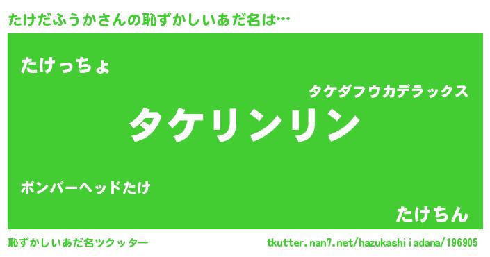 | 男性向けラノベタイトル風あだ名 | 『たけだふうかの嫁は女の子じゃないと思った?』 |
