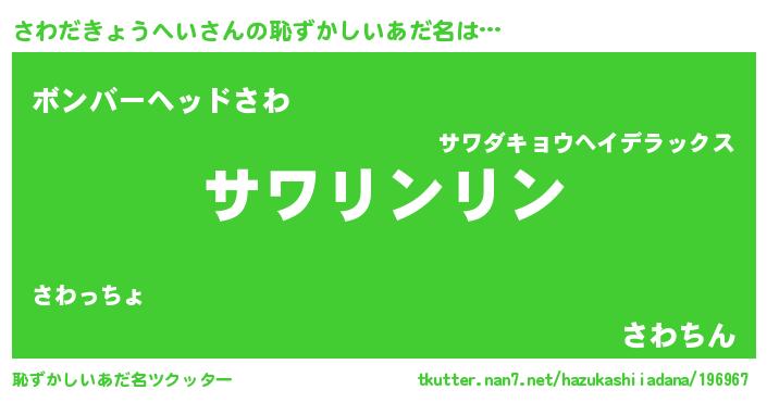 | 男性向けラノベタイトル風あだ名 | 『さわだきょうへい~年齢イコール彼女いない歴の魔法使い~』 |