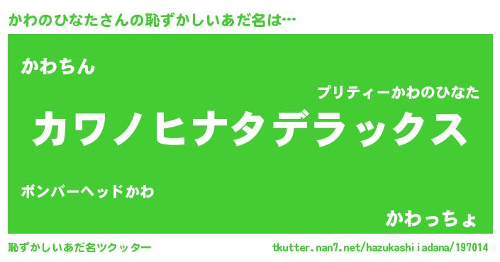| 男性向けラノベタイトル風あだ名 | 『カワノヒナタスレイヤー』 |