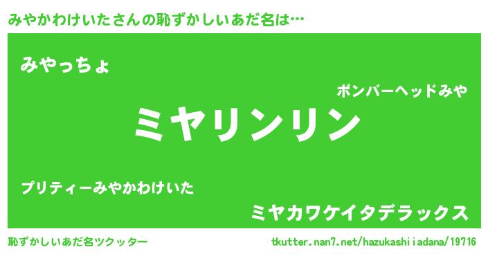 | 男性向けラノベタイトル風あだ名 | 『みやかわけいたの嫁は女の子じゃないと思った?』 |